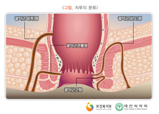 B. 치루[anal fistula] : 항문선의 안쪽과 항문 바깥쪽 피부 사이에 터널이 생겨 구멍으로 분비물이 나오는 현상